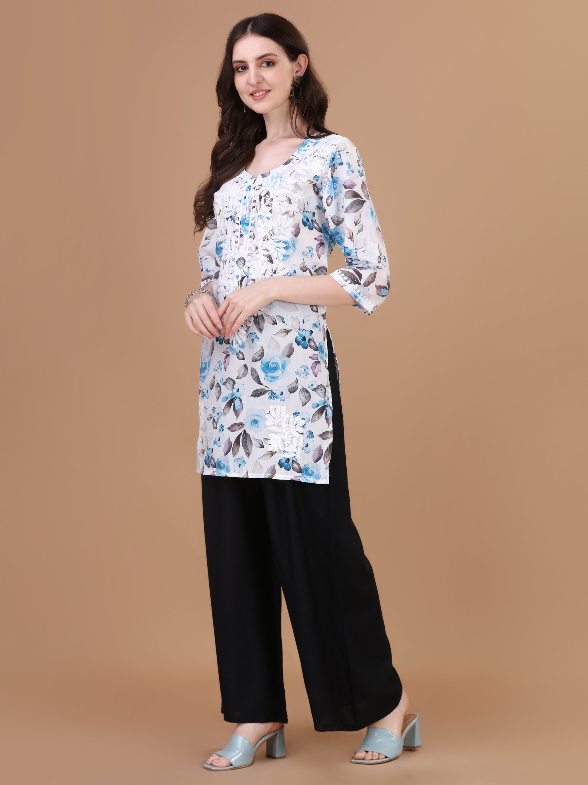 Kasha White & Blue Rose Short Mulmul Kurta