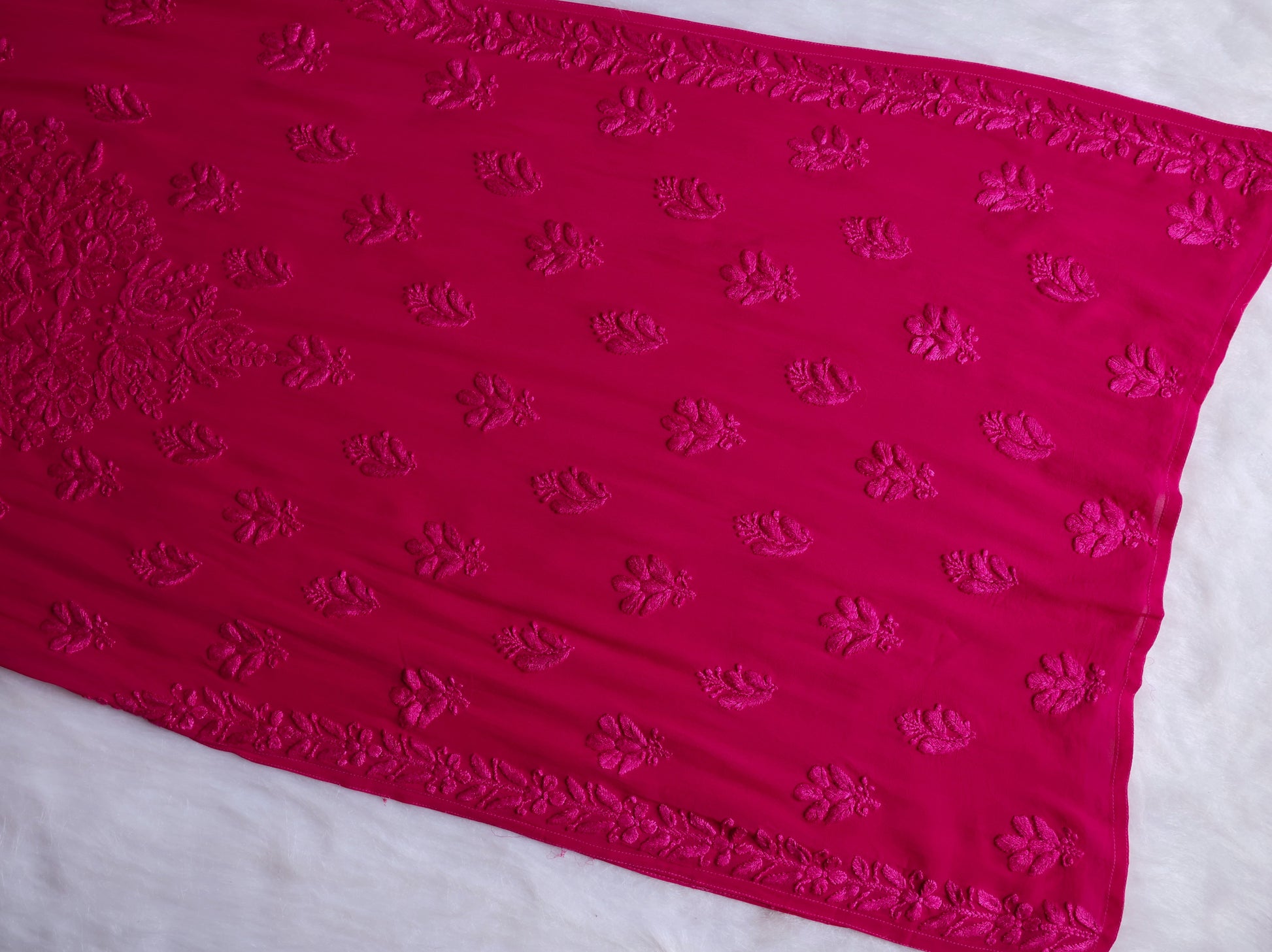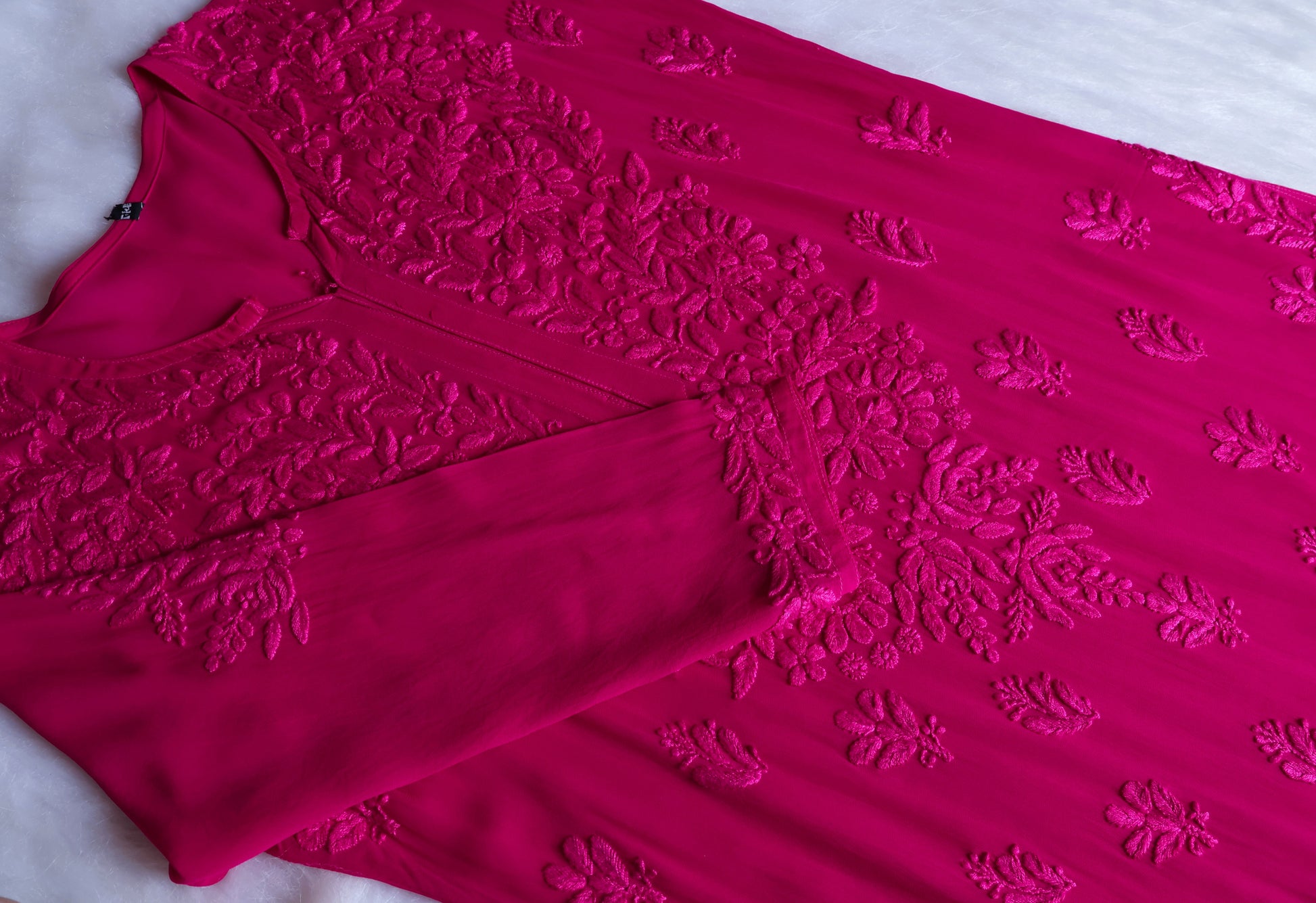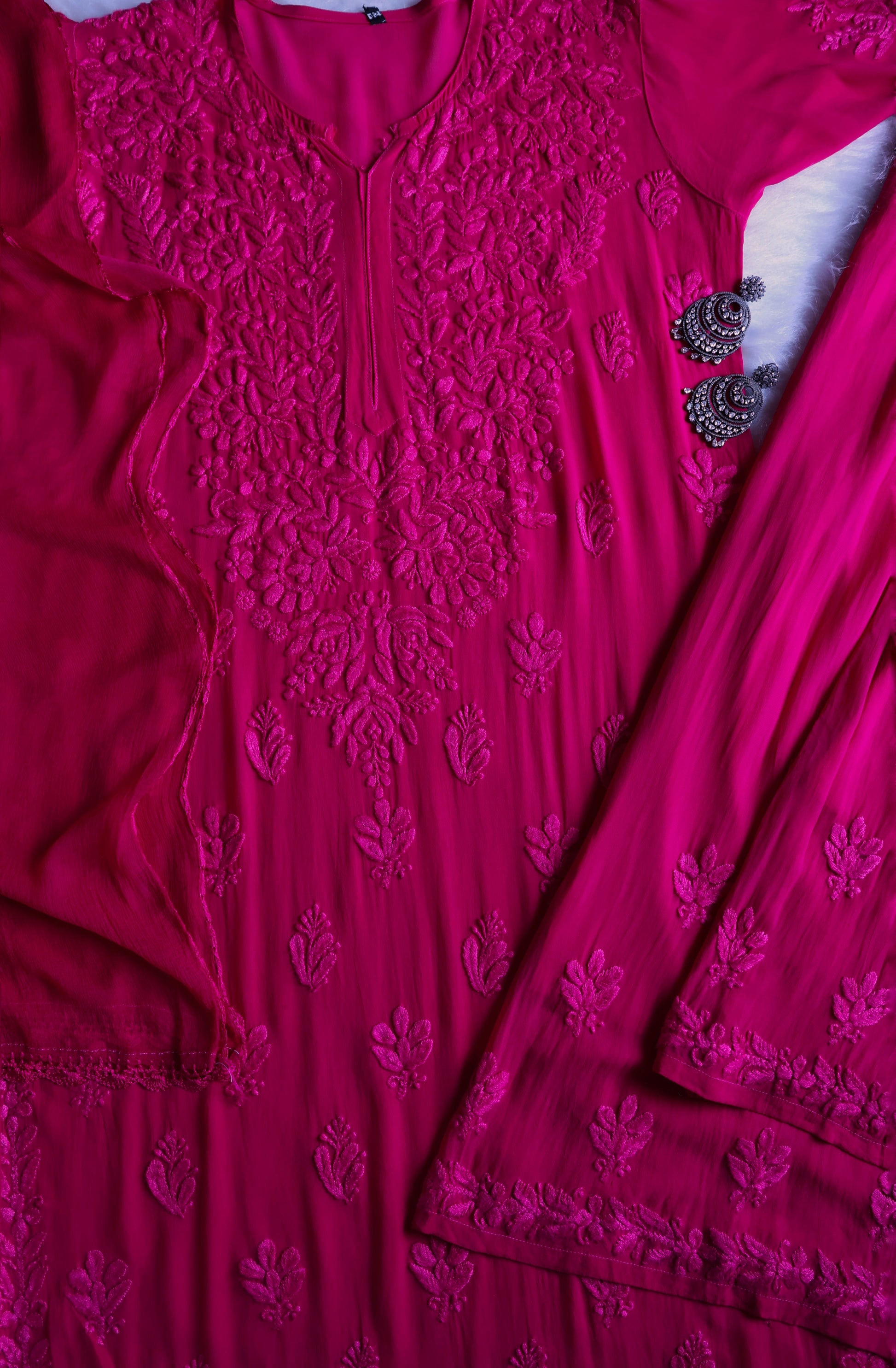 Description:- Deep Pink Long Viscose kurta with self colored chikankari in Floral & Jaal pattern paired with a matching pure chiffon dupatta and matching palazzos with pockets and astar to complete the look. The Versatile color and a full pair makes it an ideal choice for and small event coming up! Specifications:- Includes: Kurta, pant and dupattaFabric:ViscoseLength: Kurta is 48 Inches (Refer to size chart for full details) Pant is 40 inches.Sleeves: 3/4th to fullNeckline: U neckShape: StraightKurta Color:Deep Pink Embroidery Color:Deep Pink Washing Instructions: Gentle handwash separately in cold water. Do not soak or scrub. Dry in shade. Disclaimer: There can be slight variation in embroidery as every single piece is handmade. There may be 10-15% difference in colour as the screen/display settings of every phone differs.